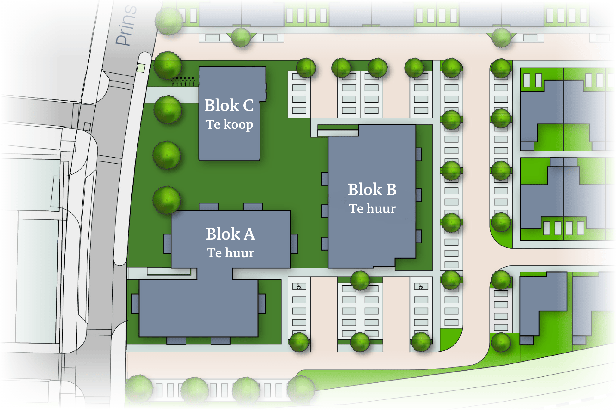 De drie appartementencomplexen staan aan de Prins Bernhardstraat. Twee ervan bieden ruimte aan 28 en 24 huurappartementen, met nog eens 6 koopappartementen in de kantoren van de oude Campinafabriek. De opzet van de wijk nodigt uit tot contact met buren, maar biedt ook voldoende rust en privacy wanneer je daar behoefte aan hebt.